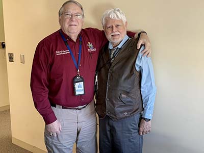 MSEA-SEIU Member Dr. George Davis, at right, a physician for the last 37 years at Riverview Psychiatric Center in Augusta, shares a moment March 18 with fellow MSEA-SEIU Member Bob Patnaude, emergency management coordinator at Riverview, as Dr. Davis approaches his retirement from state service on March 31.